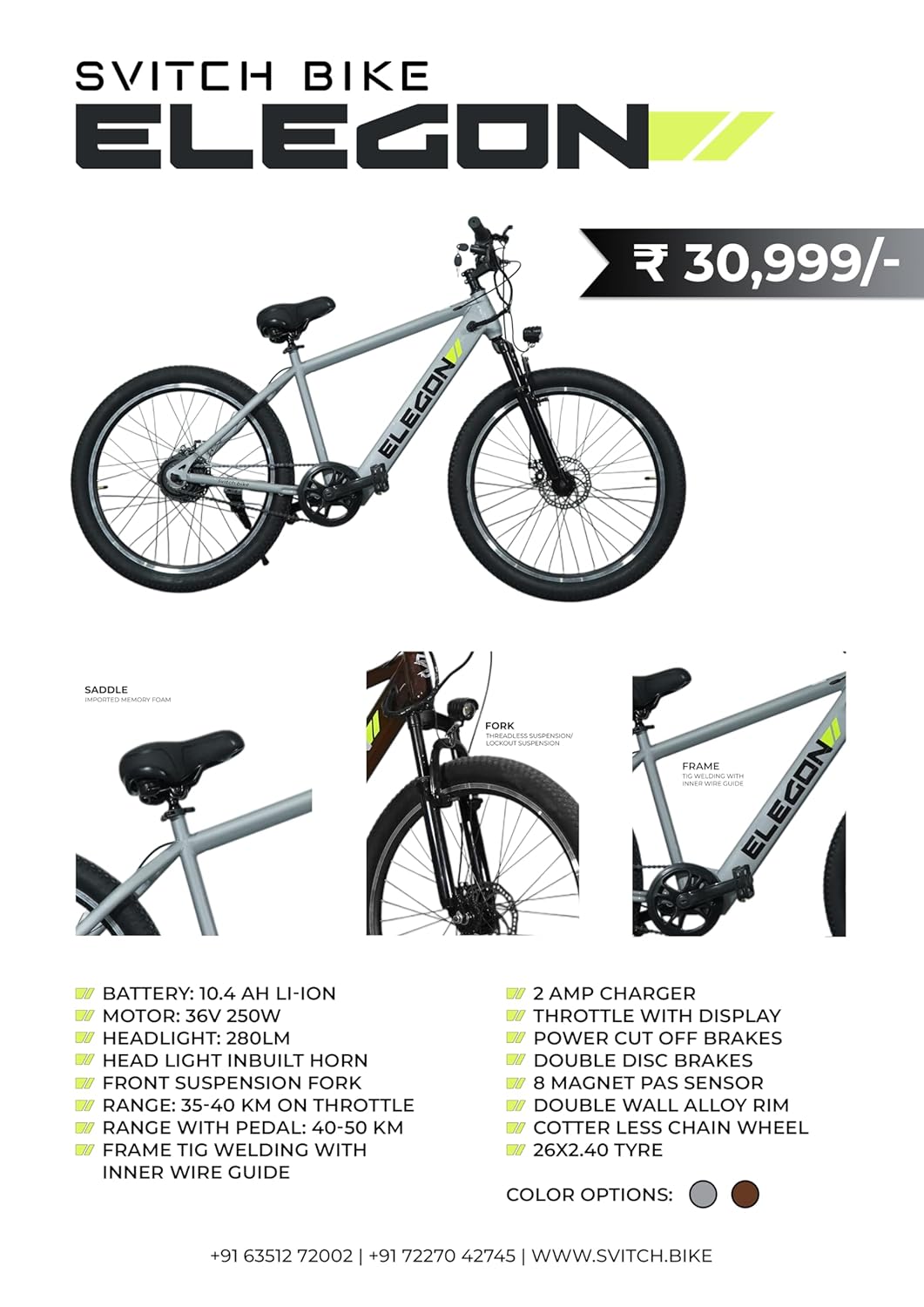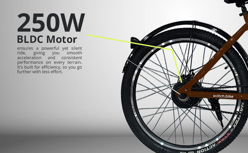 SVITCH ELEGON Electric Bicycle for Man and Woman | Battery: 10.4 AH LI-ION | Motor: 36V 250W | Headlight: 280LM | Head Light INBUILT Horn | Front Fork Suspension | Range: 35-40 КМ ON Throttle (Brown)