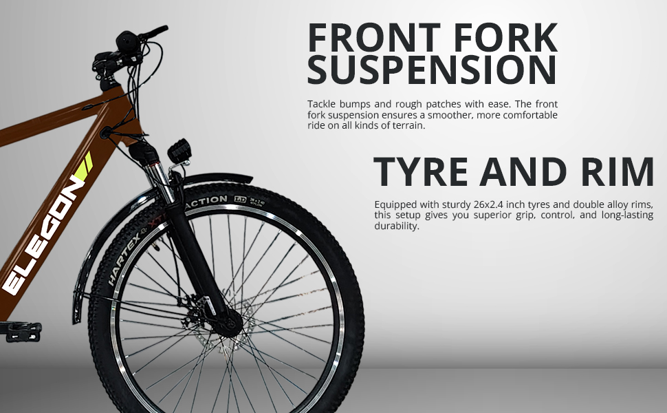 • 26×2.40 Tyre: Wide-profile 26×2.40” tyres for enhanced grip, improved stability, and a comfortable ride on all surfaces.